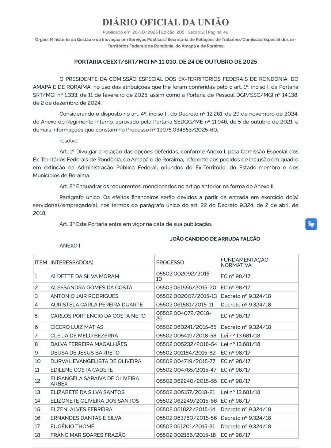 BRASÍLIA(DF) 01Nov'2025 às 16hhs92' - O Diário Oficial da União (DOU) publicado em 28 de outubro de 2025, edição 205, seção 2, página 49, traz a reparação de direitos adquiridos e até então não cumpridos a centenas de servidores que, após a transformação dos Territórios Federais de Roraima e Amapá em estados, foram desligados de suas funções e atividades estatutárias.