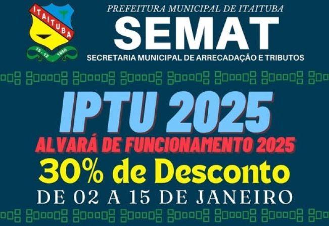 ITAIUBA(PA), 07Jan'2026 às 03h04' A Prefeitura de Itaituba publicou o Decreto Municipal nº 125/2024, que estabelece o Calendário Fiscal para a cobrança dos tributos municipais no exercício de 2025. Entre os principais destaques está o prazo e os benefícios para o pagamento antecipado do Imposto Predial e Territorial Urbano (IPTU).