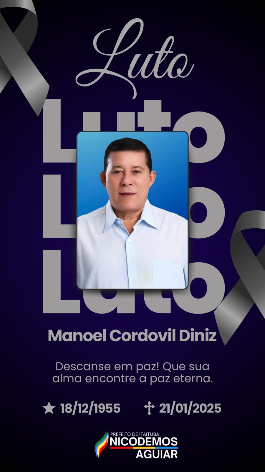 ITAITUBA(PA), 21aJan'2025 às 21h35' - É com profundo pesar que comunicamos o falecimento do renomado médico e multiprofissional Dr. Manoel Cordovil Diniz, ocorrido no dia de ontem, na cidade de Santarém, por causas naturais. (AVC e suas complicações).