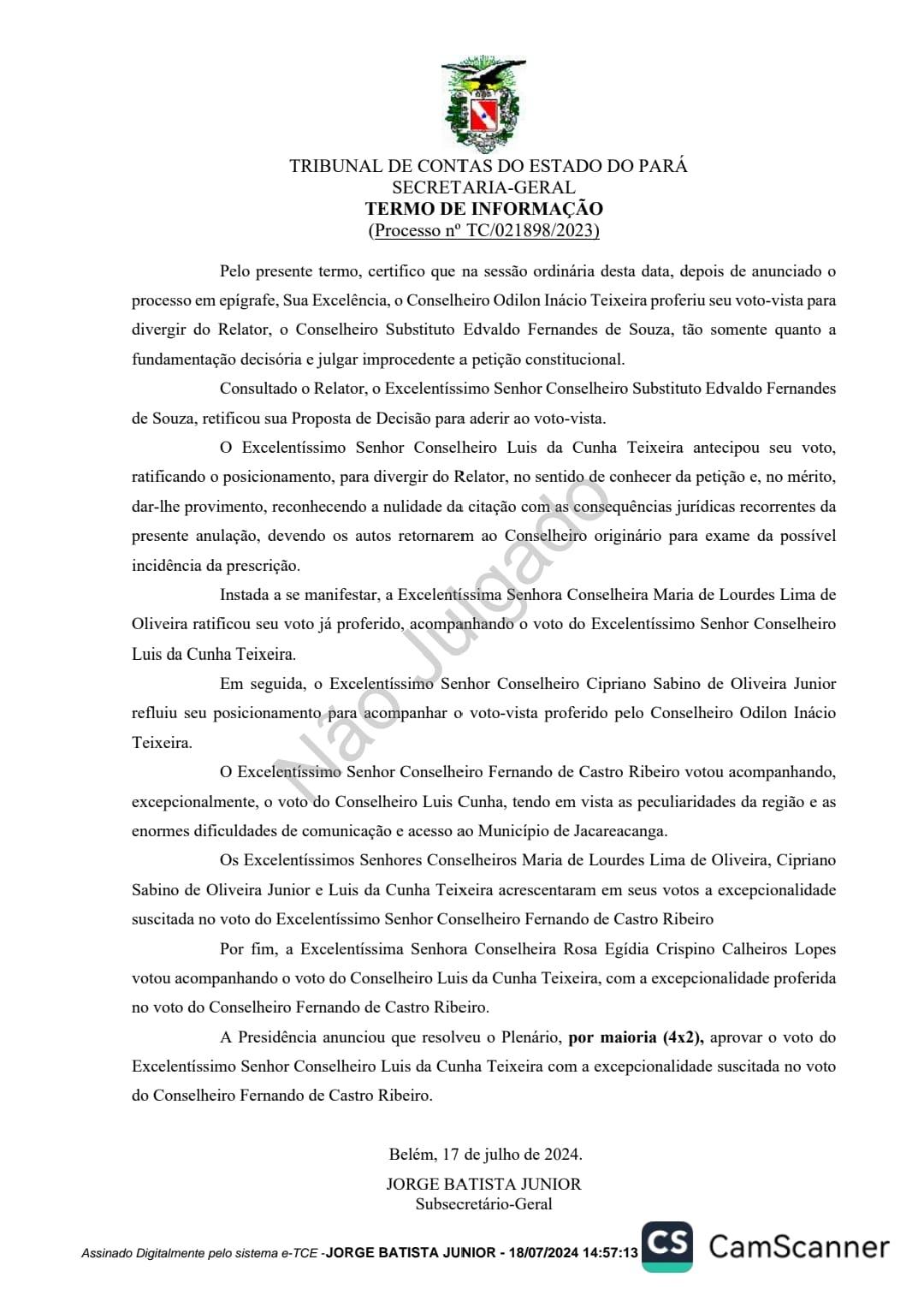 JACAREACANGA(PA) 22Jul’2024 - Sem necessidade de pormenorizar ou detalhar razões e/ou circunstâncias que levaram a julgamento de prestação de contas de responsabilidade do político EDUARDO AZEVEDO, no TRIBUNAL DE CONTAS DO ESTADO/TCE, o pleno do Tribunal, em sessão de julgamento entre tantas prestações de contas de políticos do Estado do Pará em julgamento, abriu espaço para julgar conta afeta ao Pré-Candidato à prefeitura municipal de Jacareacanga EDUARDO AZEVEDO que sem demora pelas peculiaridades do município em questão por ser uma região remota à época entre outras justificativas que se remete à prescrição de penalidades, conduziram o procedimento por um placar de quatro votos a dois, para vistas e análise do decurso de tempo que levaram-no à prescrição.