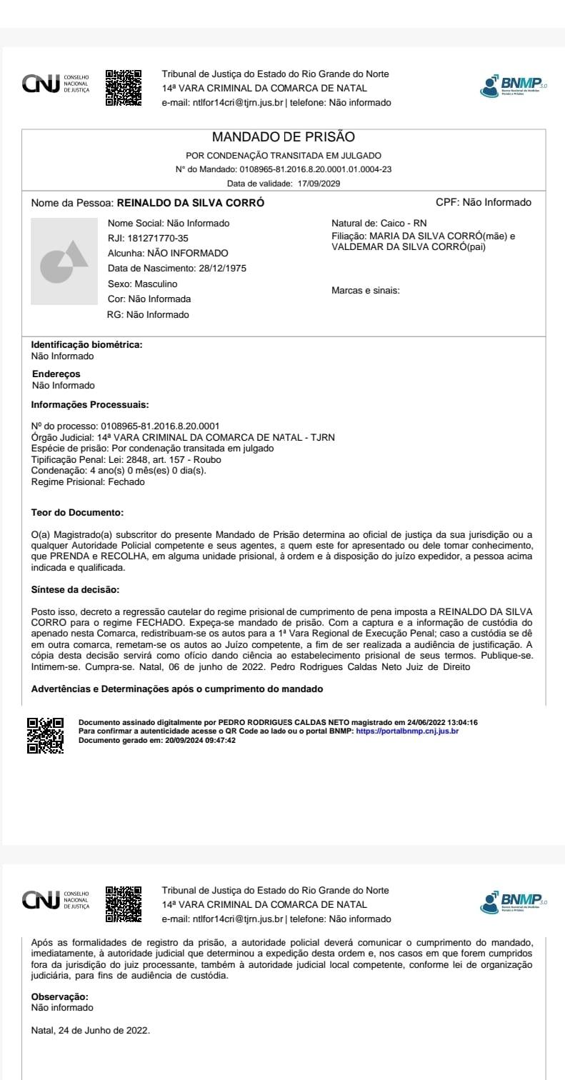 Reinaldo era procurado pela Justiça do Rio Grande do Norte por roubo e teve sua fuga interrompida. Ele foi alcançado neste domingo (10/agosto) por uma guarnição da Polícia Militar, comandada pelo Tenente Jhones quando estaria em desavença com uma mulher, e agora passará uma temporada na Penitenciária de Cucurunã, em Santarém, onde foi preso. Dependendo da situação deverá ser transferido para o distrito de culpa, em uma penitrenciária no estado do Rio Grande do Norte.