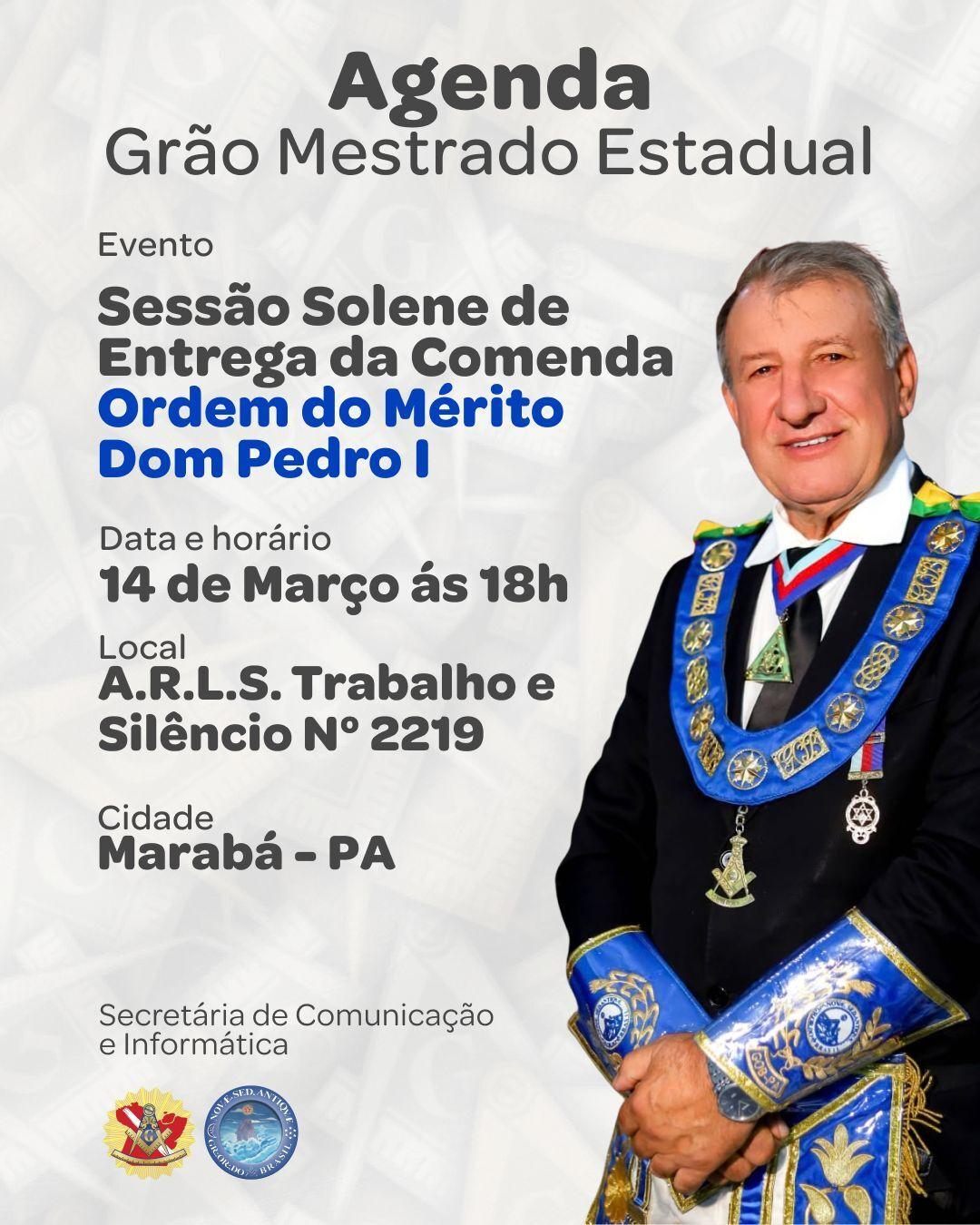 A Augusta e Respeitável Loja Simbólica “Trabalho e Silêncio nº 2219”, jurisdicionada Ao GRANDE ORIENTE DO BRASIL conduzindo seus trabalhos atraves do Rito Adonhiramita, tem a elevada honra de convidar os amados Irmãos e toda a Família Maçônica para a Sessão Solene de Entrega da Comenda – Ordem do Mérito Dom Pedro I, que se realizará: