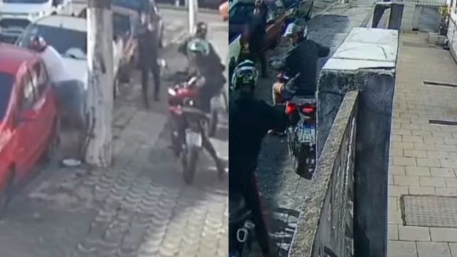 Um vídeo, de uma câmera de monitoramento, mostra o momento em que a mulher estava subindo na moto, quando foi abordada pela dupla que estava em uma motocicleta. Durante a tentativa de roubo, ela saiu de cima da moto e o criminoso que estava na garupa assumiu o comando do veículo dela